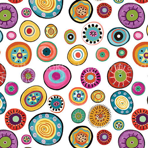 When Alice first gets to the bottom of the Rabbit Hole she grows so tall that she can’t fit through the door to Wonderland and she begins to cry. As she shrinks, her tears flood out the little door taking her and many Wonderland residents with the current in a print called “Sea of Tears”. The “Cheshire” cat looms in the night sky watching over Wonderland. Painted, spotted roses still dripping with wet paint sit on a background of oversize spots just hoping to blend in and escape the Queen’s notice.